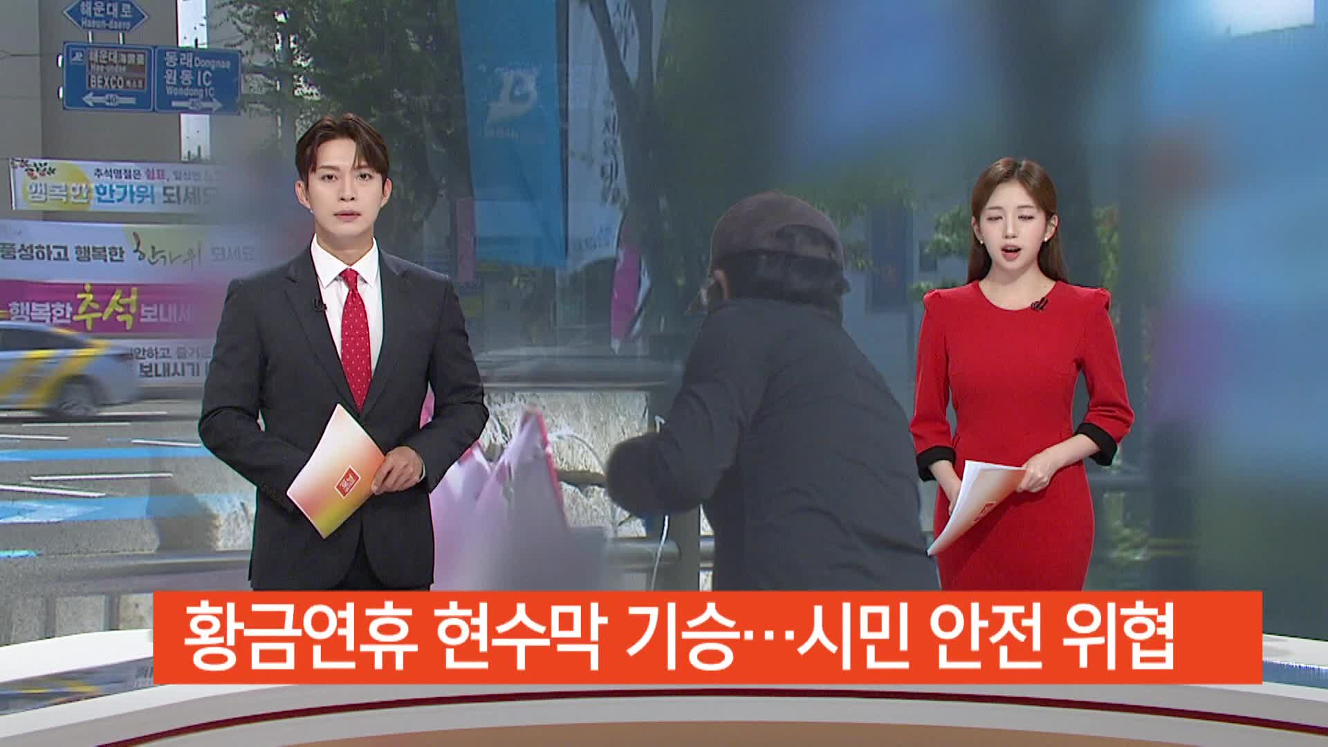 <앵커> 긴 황금 연휴 마지막날, 잘 보내셨습니까? 길었던 추석연휴 동안 곳곳에 내걸린 각종 현수막들 많이 보셨을텐데요, 보행자와 운전자 시야를 가리는 탓에 시민 안전을 위협하고 미관까지 해치는 현수막 홍수에 몸살을 앓았습니다. 이민재 기자입니다. <기자> 도로변이 온통 현수막으로 도배가 됐습니다. 정치인들의 추석 인사 현수막부터 아파트 분양홍보 현수막까지, 도로변에 흡사 현수막 장막이 생겼습니다. 횡단보도*어린이보호구역 할 것 없이 무분별하게 설치돼, 시민 안전까지 위협합니다. "최장 열흘에 달하는 역대급 황금연휴를 지나면서 보시는 것처럼 거리는 현수막 천지가 됐습니다. 그런데 이 현수막들, 표시기간조차 적혀있지 않다보니 불법 현수막이나 다름 없습니다." 차량통행이 많은 곳이라면 어디든 상황은 마찬가지. {보행자/"현수막이 너무 지저분하게 걸려있으니까 보기에 아무래도 안좋죠. 걱정도 되죠. 위아래로 제각각 돼있어서, 시선을 빼앗기게 되니까. 차가 잘 안보일 수도 있겠죠."} 연휴 기간 지자체들의 단속이 느슨해진 틈을 노린 겁니다. "이날 부산 해운대의 한 도시철도 역사 인근 반경 1km 구간에서 철거한 현수막만 3백여 장, 평소의 10배 수준입니다. 과태료 처분을 하더라도 그때 뿐, 막무가내 설치는 계속됩니다." {신준식/부산 해운대구 창조도시과 현장팀장/"평소에 저희가 다니면서 정비를 하는데, 추석 쇠고 와보니까 불법적으로 횡단보도 쪽에도 많이 붙어있네요."} 특히 정치 관련 현수막은 임의로 철거할 수도 없습니다. 현행법상 정치인*정당은 별도 신고나 허가 없이 15일 동안 현수막 게시가 가능하기 때문입니다. 자진철거를 기대할 뿐입니다. 이번 추석을 앞두고 부산의 주요 관광지와 교차로 등을 대상으로 현수막 청정거리 지정이 이뤄졌지만 역시 큰 효과를 거두진 못했다는 평가입니다. KNN 이민재입니다. 영상취재 김태용 영상편집 김은희
